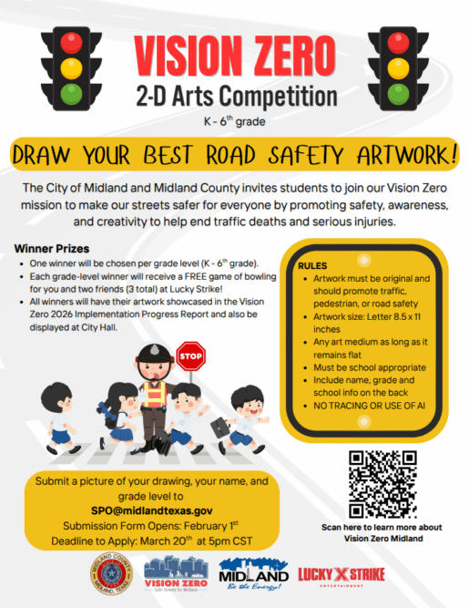 What happened: Midland County, City of Midland, and local partners are inviting students across the community to help promote roadway safety through two new Vision Zero art contests. Elementary students in grades K–6 can submit original artwork focused on safety themes, while students in grades 7–12 can create one-minute videos on topics such as slowing down, avoiding distractions, or watching for pedestrians.